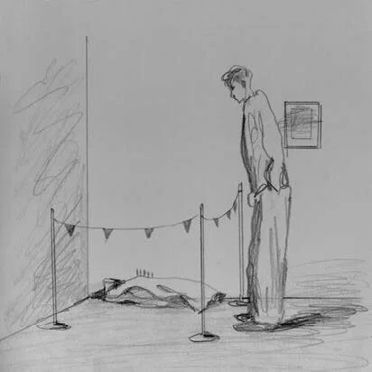 Trousers that seem to have been dropped casually, are lying on the floor in the corner in the gallery. They are cordoned off by a rope barrier, either to protect the viewer from what is happening or what could happen beyond the barrier, or, on the contrary, to protect the object itself from the viewers. In fact, in this object, in these trousers, there is one special quality: ‘little white men’ are walking along their surface in a row, one after another. There are 18 small flat figures made of paper and having a height of 3 cm. No special lighting is aimed at this ‘object,’ and the viewer can see it completely accidentally by running into it, or he can miss it altogether.