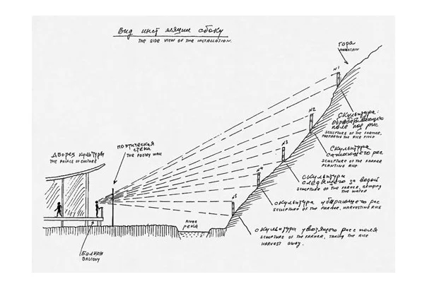 The entire trick of the whole concept of the installation is that when the visitors to the palace come out onto the open-air balcony and reach its middle, they see right in the center a round elevation. You can step up onto it, just like a step, but only one person at a time. Having stepped up onto it and looking through the frame in the direction of the mountain, the viewer suddenly sees that the texts optically coincide exactly with the sculptures standing far away from him on the mountain! Under each text, or above it, there is a sculpture that coincides with the corresponding text in meaning, and it is as though these figures become illustrations of these texts, and on the contrary, each text reveals the content of the activity depicted by the figures on the mountain. (These texts have an informative function, as well, since not everyone today knows how rice is produced.) Hence, it is as though what emerges before the reader/viewer standing on the step is a page of a book hanging in the air, wherein a single plane there is both a text and an illustration. Here are the texts of this ‘page.’
